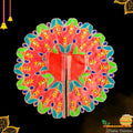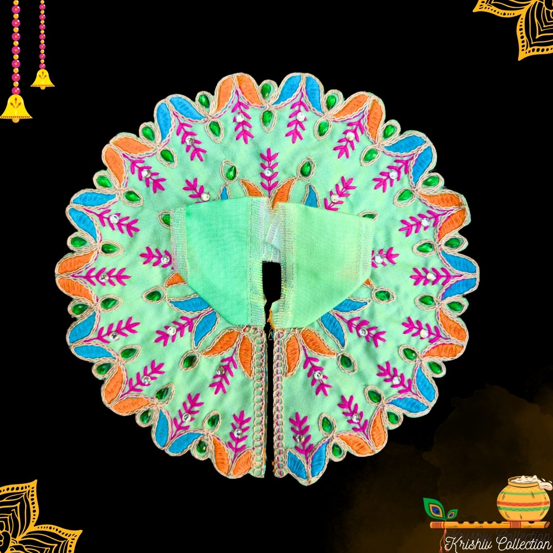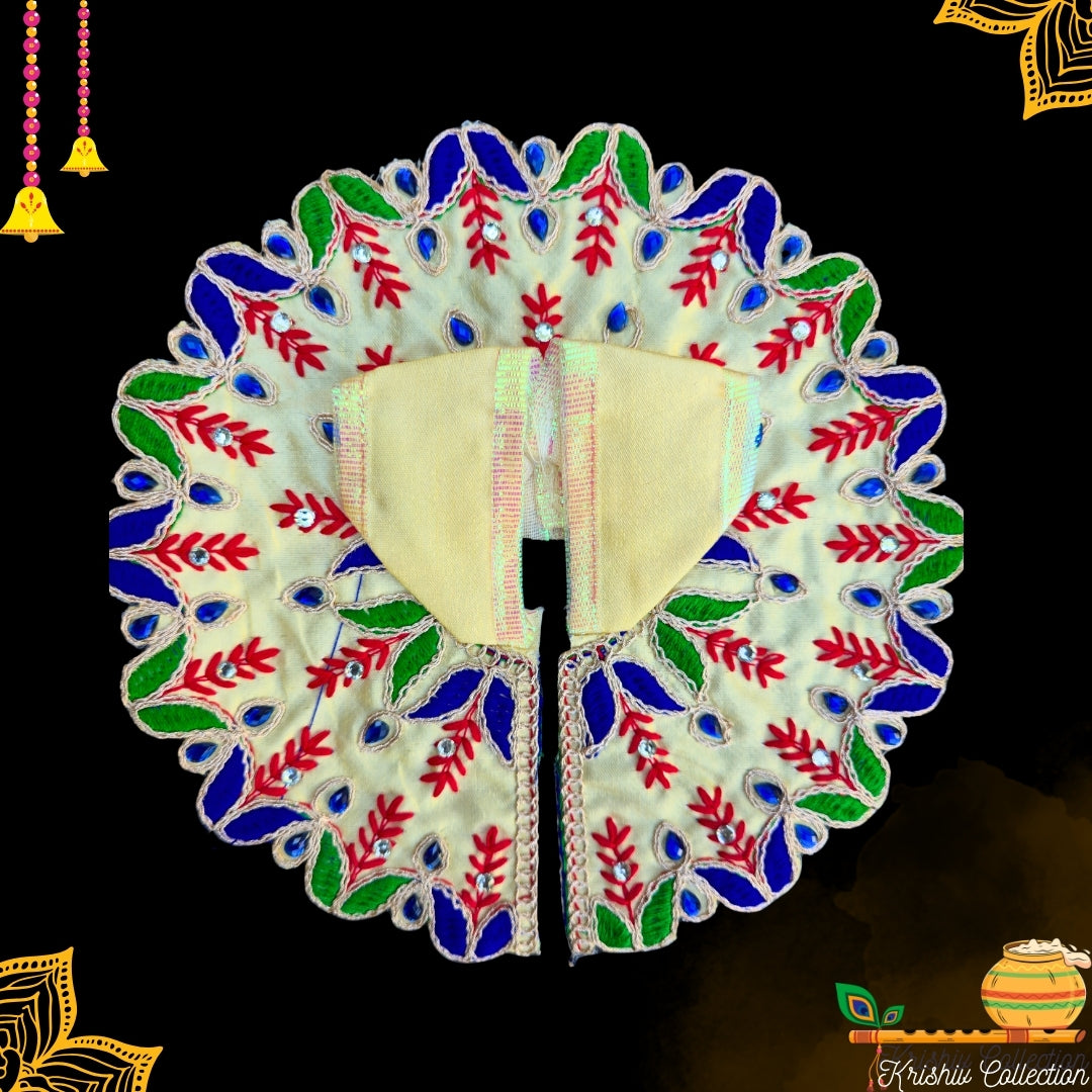 Adorn your Laddu Gopal Ji in this elegant cream poshak, beautifully embroidered with vibrant red, blue, and green leaf motifs. The intricate threadwork and shimmering accents give your deity a traditional yet graceful appearance — perfect for pooja rituals and festive décor.