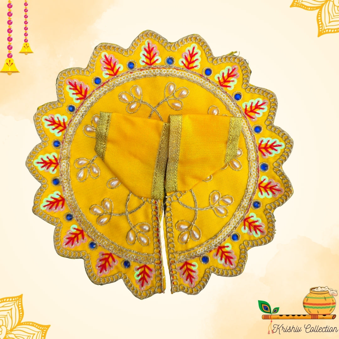 Adorn your divine Laddu Gopal Ji in this royal magenta pink poshak, embellished with golden embroidery, blue stone highlights, and intricate lacework. The combination of vibrant color and detailed craftsmanship brings elegance, positivity, and charm to every darshan.