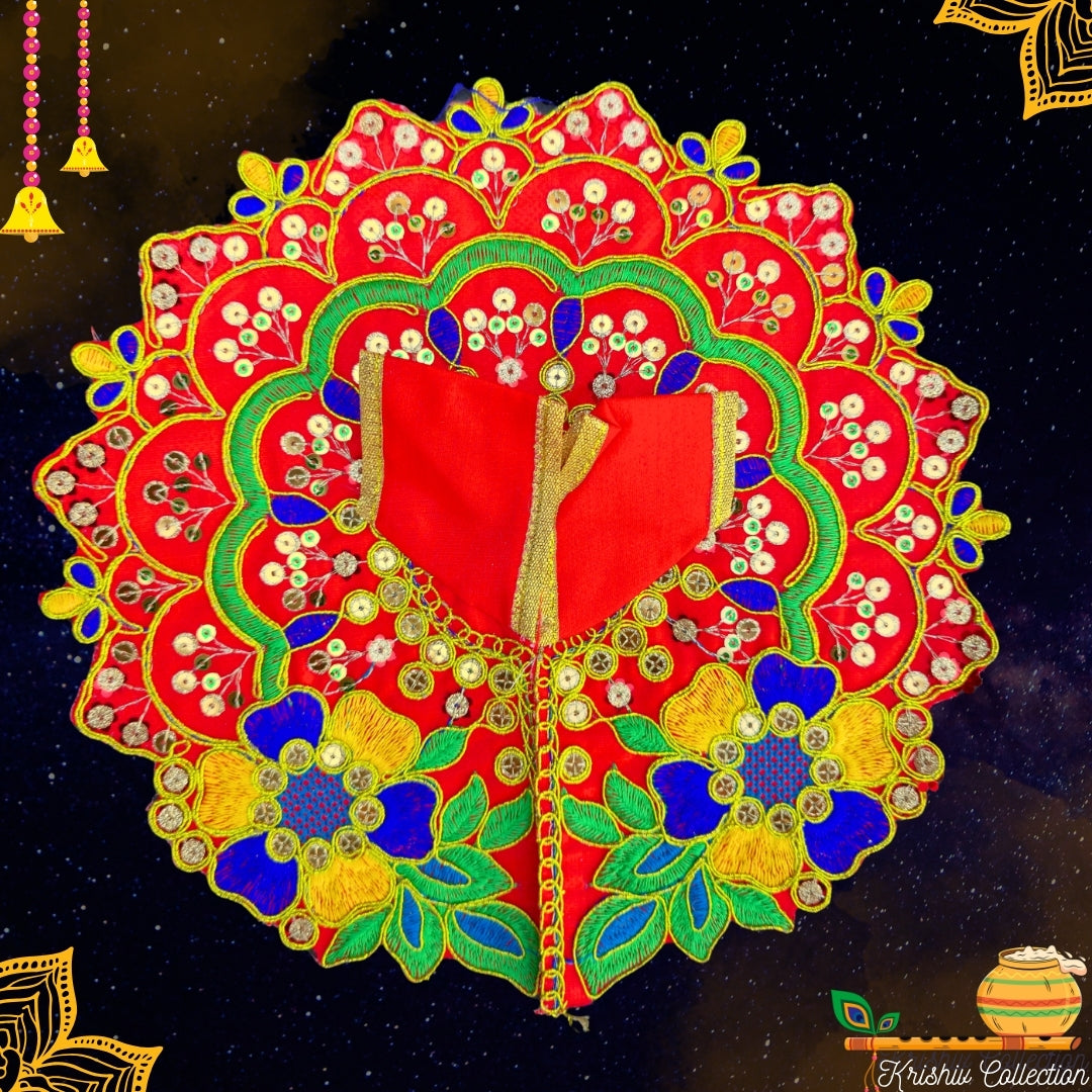 Add divine brightness to your altar with this vibrant red floral poshak, beautifully handcrafted with colorful blue and yellow embroidery, mirror work, and golden lace edging. The rich colors and elegant detailing make it perfect for Janmashtami, pooja rituals, and gifting.